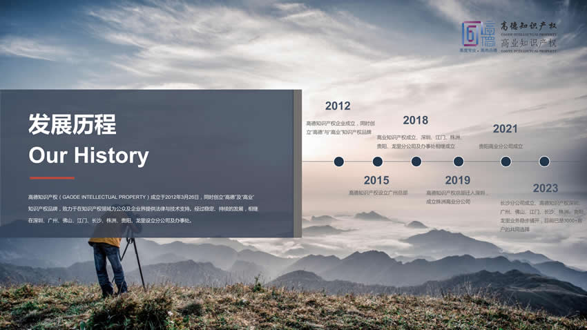 高德知识产权是经国家知识产权局批准设立,并在中国商标局登记备案的,国家认可的知识产权服务机构。公司自2012年成立以来,分别在广州、深圳、佛山、江门、株洲、贵阳、龙里设立公司及办事处,专为国内外广大客户提供全方位的商标注册、驰名商标认定、专利申请、版权登记、高新技术企业认定、知识产权海关备案、知识产权侵权维权以及知识产权保护相关的行政和法律咨询服务。