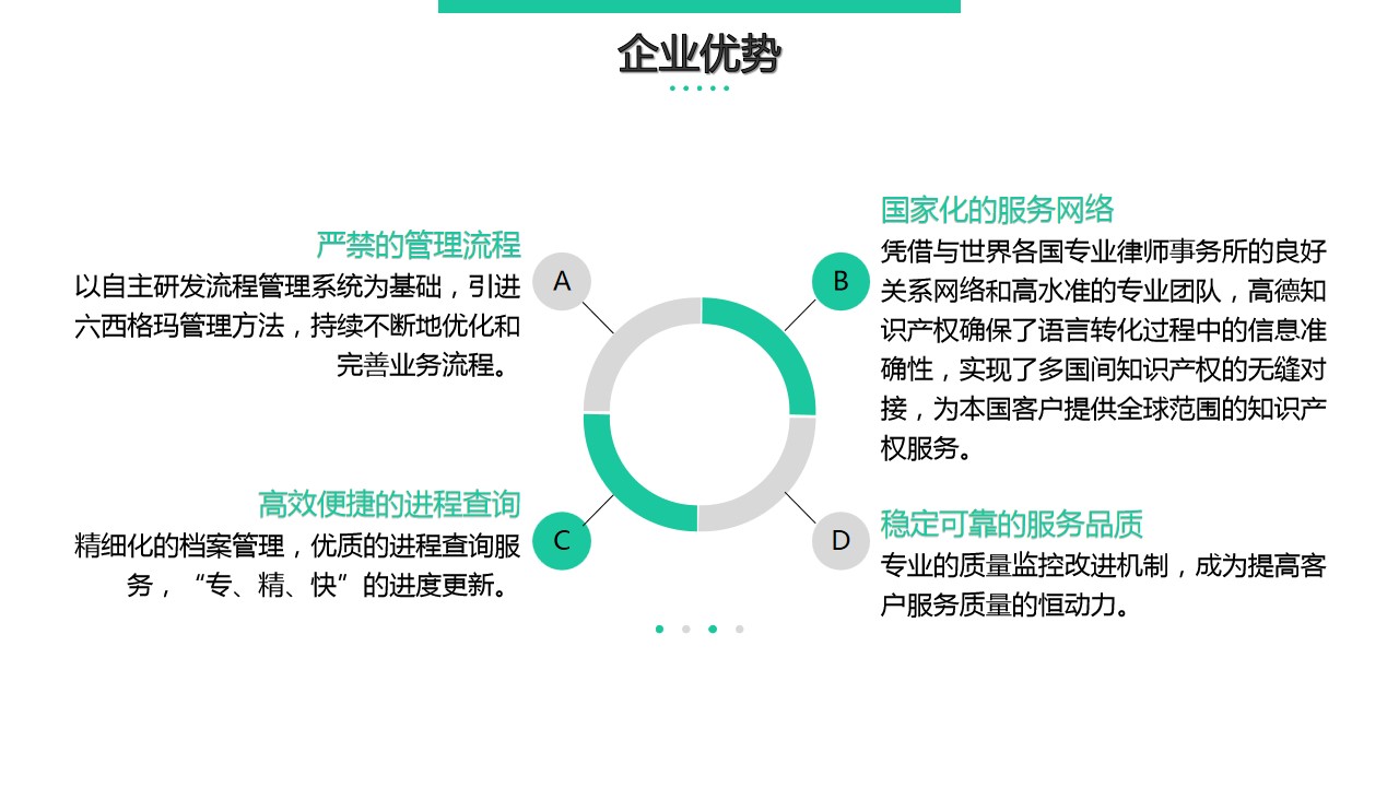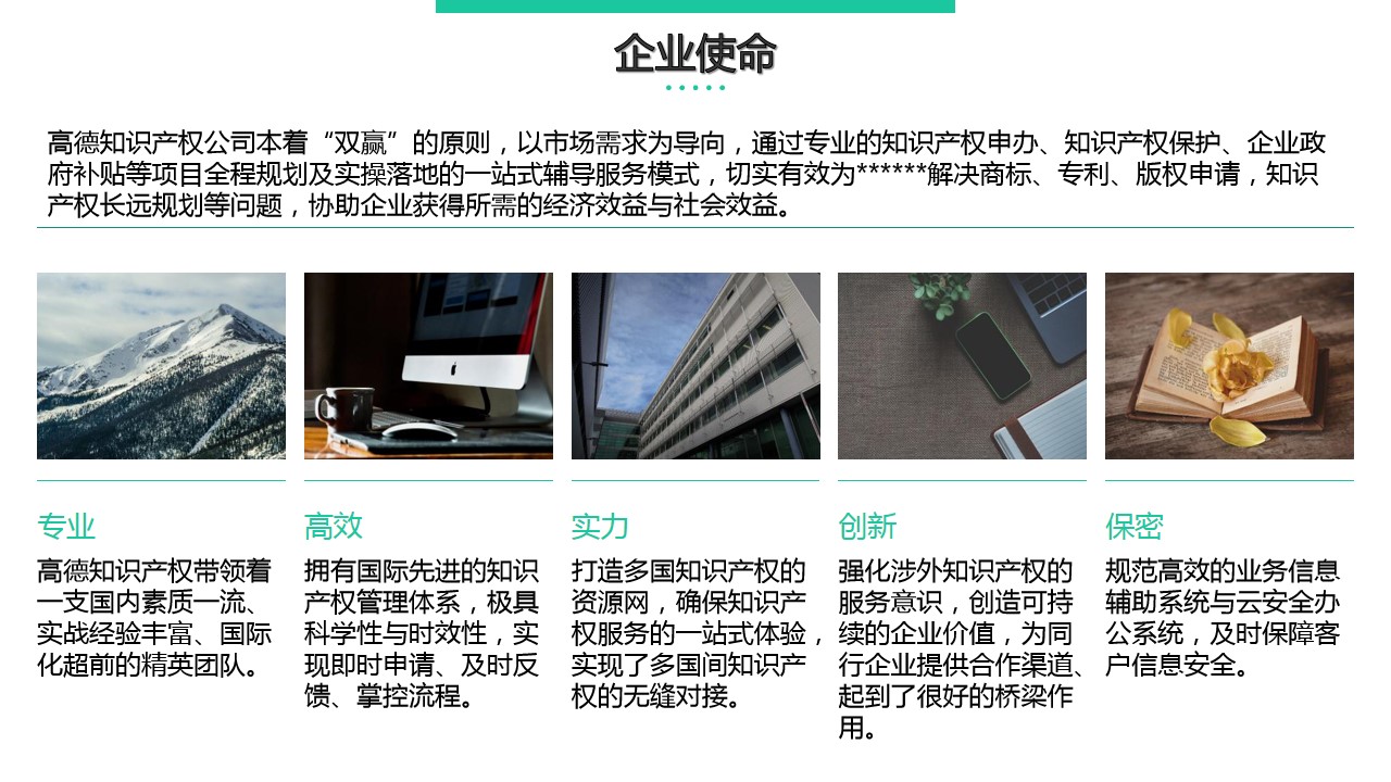 公司由多名长期从事知识产权工作的专利代理人、商标代理人、专利工程师、诉讼律师专业人才组成,自公司成立以来,高德一直秉承着“高度专业、高尚品德”的经营理念,坚持“诚信、严谨、高效、务实、用心”的服务标准,赢得了众多企业的信赖和好评。通过专业的水平和不懈努力为企业知识产权战略提供咨询服务,围绕提升企业知识产权创造优势、知识产权运用优势、知识产权保护优势三方面开展优势企业培育工作,不断增强市场竞争力